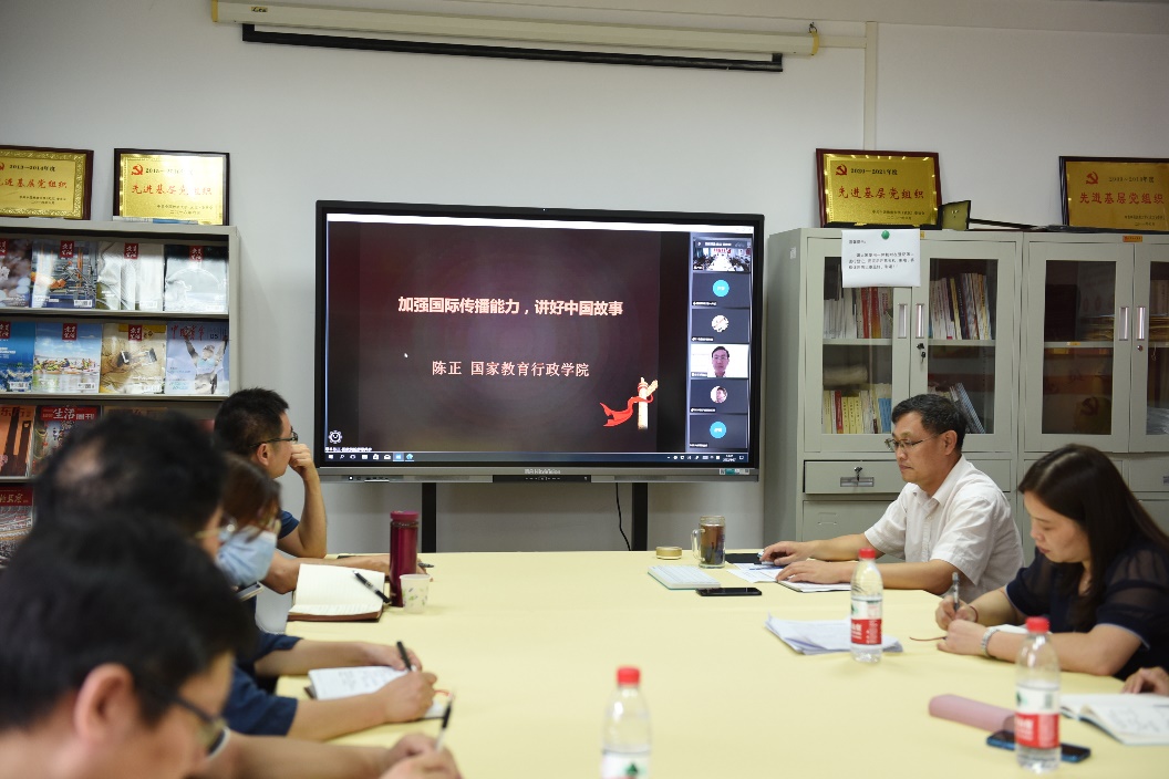 (通讯员杜冬琴、邓维 摄影 戴薇)2022年8月27日下午,作为公司新学期工作研讨会活动之一的 “南望今声”外语论坛第35期在太阳集团tyc539北一楼102会议室举行。应公司党委书记刘世勇邀请,国家教育行政公司教育领导与管理国际比较研究中心主任陈正副教授在线上为公司师生做题为“加强国际传播能力,讲好中国故事”的报告,报告由刘世勇主持,公司师生线上线下近200人参与学习交流。