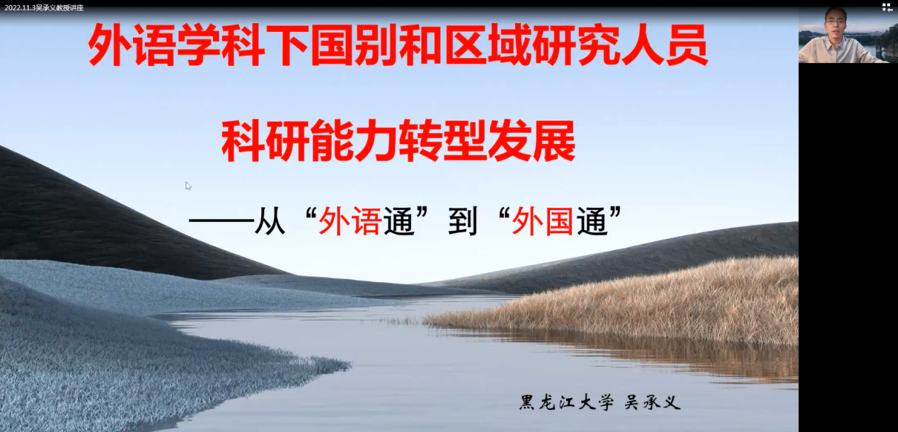 (通讯员 王国念)2022年11月3日下午14时30分,作为校庆70周年系列活动之一的“南望今声”外语论坛第40期在线上如期举行。黑龙江大学吴承义教授应邀为公司师生做了题为《外语学科下国别和区域研究人员科研能力转型发展:从“外语通”到“外国通”》的讲座。讲座由公司太阳集团tyc539王国念副教授主持,太阳集团tyc539及其他兄弟高校近200名师生参与学习交流。