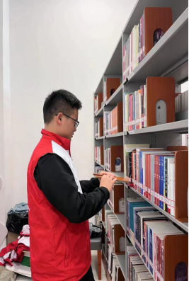 在本次活动中,志愿者们跟随着工作人员的脚步,分为2组进行工作:第一组的志愿者负责上架书籍的工作,主要工作安排是用机器扫描上架图书,并按图书类型分类上架。志愿者们徜徉在书籍的海洋里,感受着知识的波澜。轻取轻放,是对工作的负责,是对图书的爱护,亦是对知识的尊重。一本本图书经过志愿者的手中,回归书架,红白志愿服与古色古香的图书馆交相辉映,更添一分活力。志愿者们尽职尽责,乐此不疲,为图书馆的工作人员减轻了图书规整的工作负担,用热情、笑容和汗水传递着。