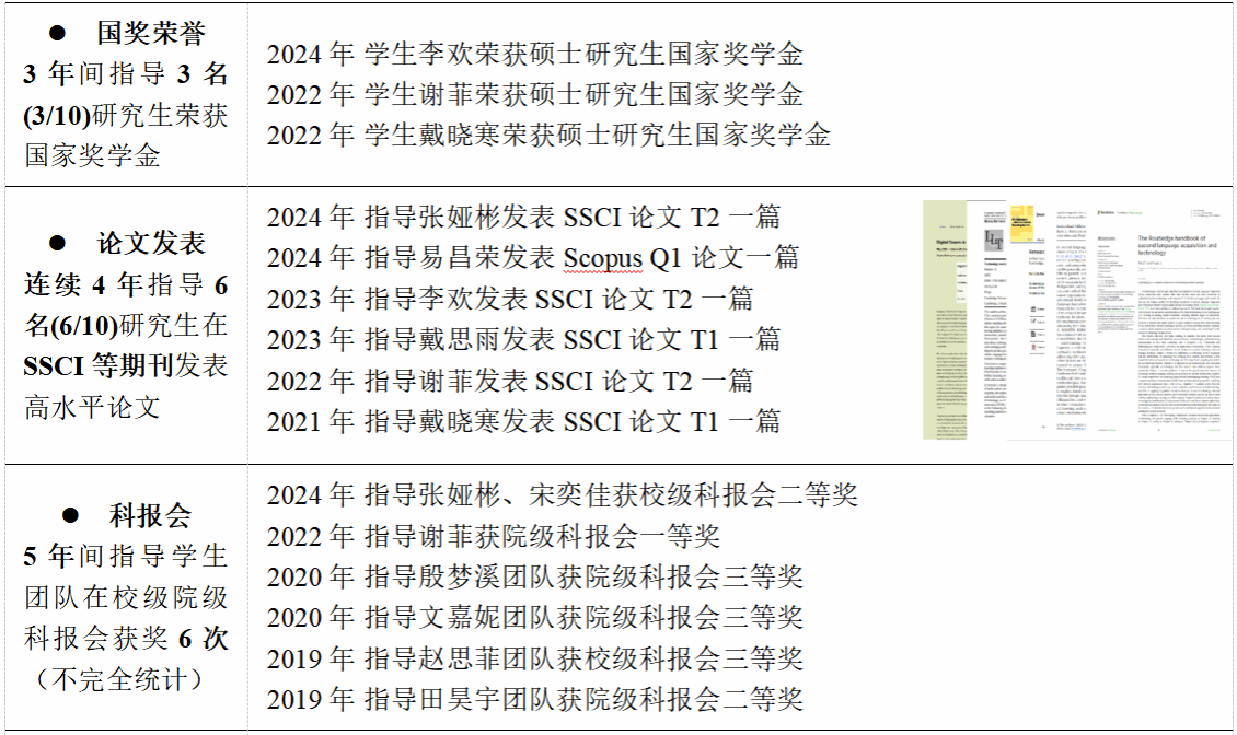 李菲副教授的高尚师德也得到了社会与学术界的广泛认可。她参与的教学团队曾荣获多个教学荣誉和奖项,如2021年荣获“国家级大创项目优秀指导教师”、“暑期社会实践优秀指导教师”和首届教师教学创新大赛湖北省三等奖、2020年荣获外研社“教学之星”大赛英语专业组全国复赛一等奖等荣誉,这些都体现了她对员工全方位成长的支持与帮助。校外,她在知名科研培训中心(山东省国高教育研究有限公司)担任资深学术导师,系统性地开展研究方法专题线上课程教学工作,为来自全国多所高校的研究生及青年教师提供专业指导,显著提升学术素养和科研创新能力,助力学术职业发展。